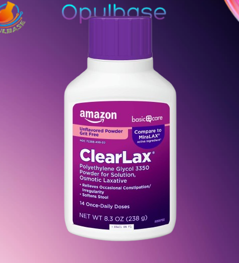 Amazon Basic Care ClearLax is a generic equivalent to MiraLAX, featuring Polyethylene Glycol 3350 as an effective osmotic laxative. This unflavored powder mixes easily into beverages to provide gentle, predictable relief from occasional constipation by drawing water into the intestines for softer stools and easier passage.